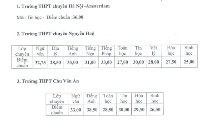 Theo đó, 3 trường có điểm chuẩn giảm một số lớp chuyên là Trường THPT chuyên Hà Nội - Amsterdam, Trường THPT chuyên Nguyễn Huệ. Trường THPT Chu Văn An.
