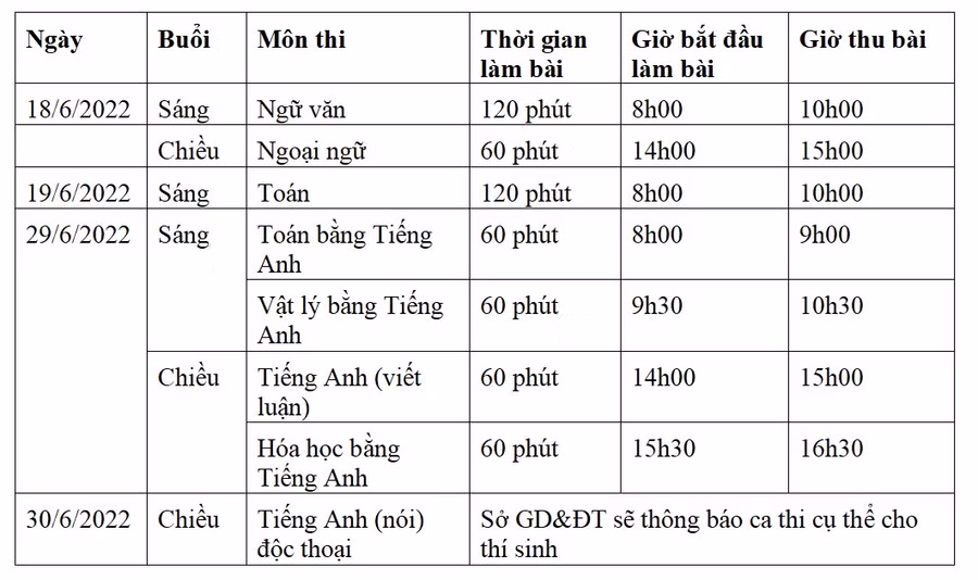 Đối với môn Tiếng Anh, thí sinh phải dự thi 2 bài thi: Bài thi viết luận bằng Tiếng Anh, thời gian 60 phút và bài thi nói tiếng Anh theo chủ đề do thí sinh bắt thăm ngẫu nhiên, thời gian làm bài thi 10 phút, trong đó có 5 phút chuẩn bị.