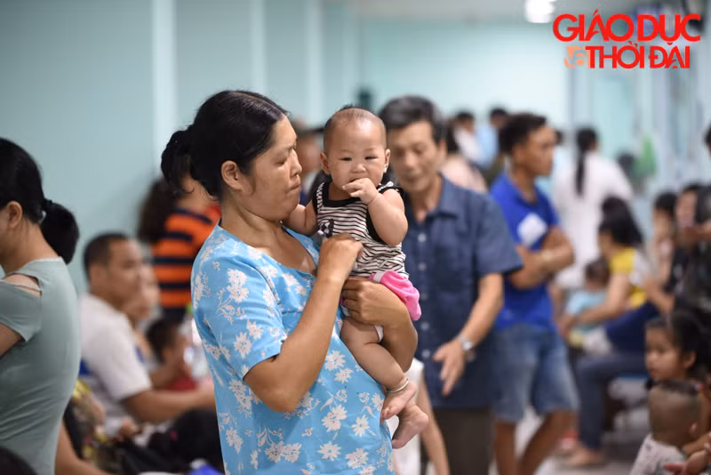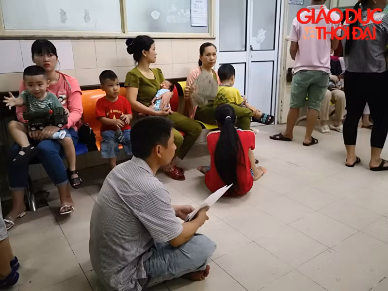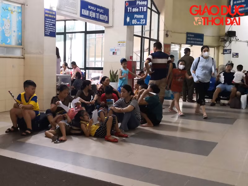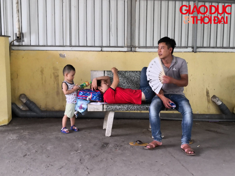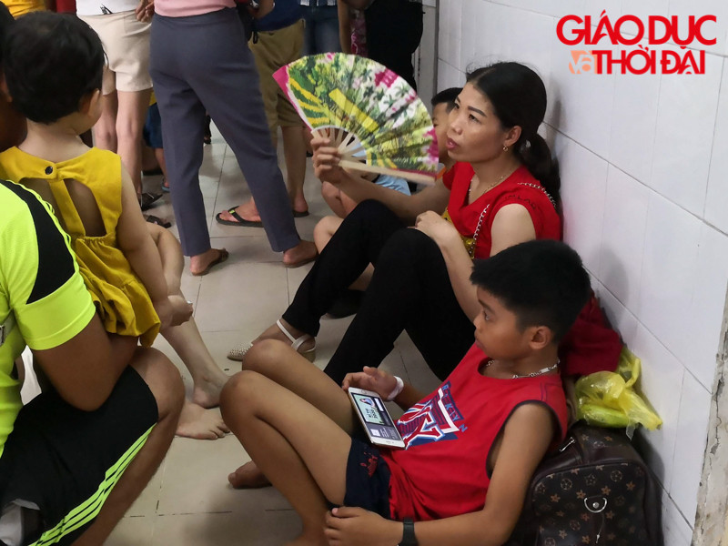 | Hành lang, ghế đá Bệnh viện Nhi TW (Hà Nội) kín chỗ, la liệt người ngồi, nằm trên những chiếc chiếu tạm bợ. Có người phủ tạm chiếc khăn, tờ báo lên mặt để ngủ chập chờn. Nhiều người nhà bệnh nhân chọn nằm ngay dưới nền gạch, lối ra vào các phòng bệnh vì ở đây có quạt máy. |