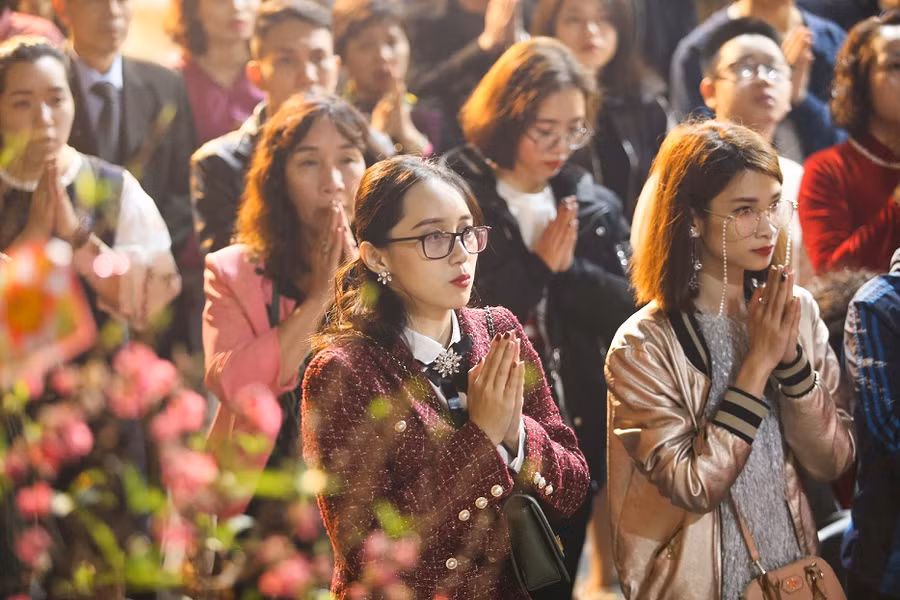 | Tại chùa Quán Sứ, một trong những ngôi chùa linh thiêng và lâu đời ở Hà Nội, sau giao thừa đông đảo người dân đã đến để cầu bình an cho năm mới Kỷ Hợi. |