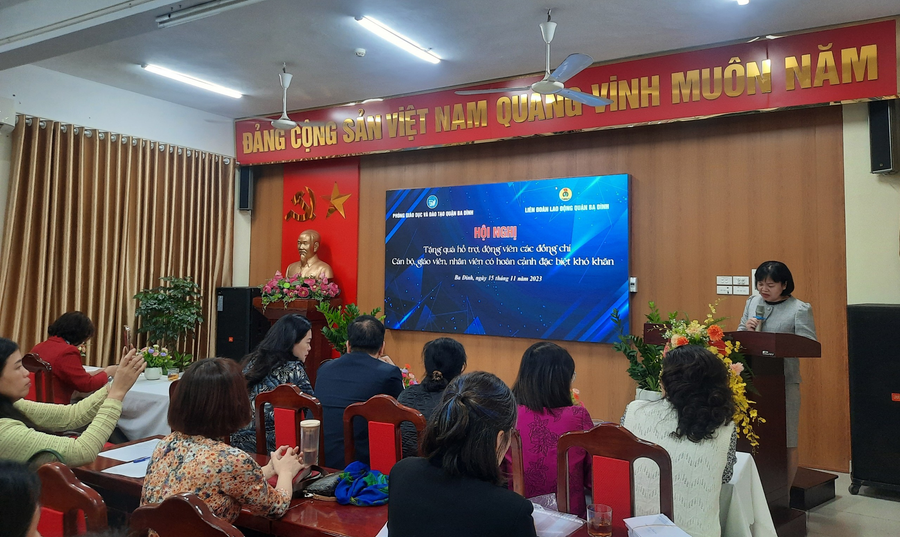 Tại hội nghị, Chủ tịch Liên đoàn Lao động quận Ba Đình - Bùi Phương Chi gửi lời chúc mừng, tri ân tới các thầy cô giáo và người lao động ngành giáo dục nhân dịp kỷ niệm Ngày Nhà giáo Việt Nam. Đồng thời, thăm hỏi động viên và chia sẻ tới 57 cán bộ, giáo viên, nhân viên có hoàn cảnh đặc biệt khó khăn trên địa bàn quận Ba Đình.