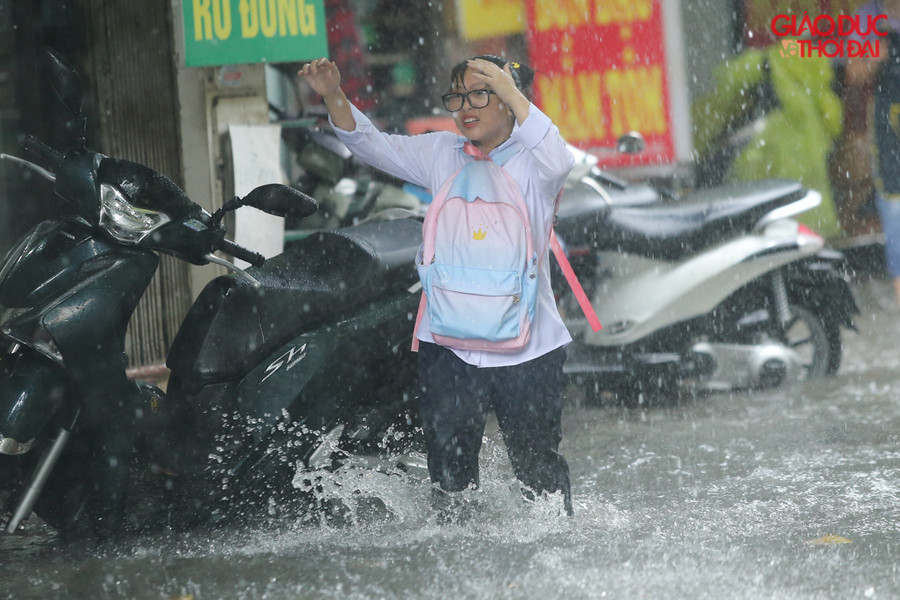 | Nhiều học sinh đi học sáng di không chuẩn bị áo mưa nên đã đội mưa, ngập để đi về. |