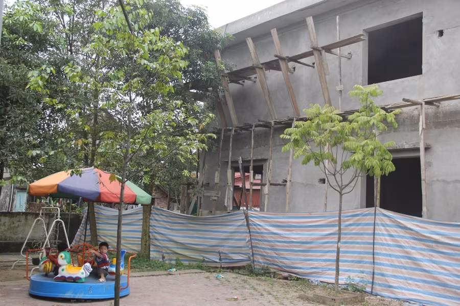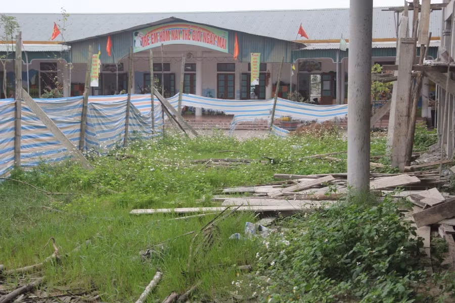 Có măt tại Trường Mầm non thị trấn Cẩm Xuyên ngày 9/4, theo ghi nhận của phóng viên, công trình không có một bóng công nhân nào đến thi công. Tính đến thời điểm hiện tại, công trình đã hoàn thành được phần xây dựng và gia cố các phòng học, còn các hạng mục khác như lát gạch, mái, cửa, sơn, sân bãi,... vẫn đang còn dang dở.