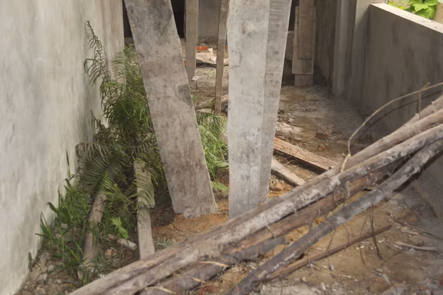 Do lâu ngày không thi công nên công trình giống như một trường học bỏ hoang, xung quanh cây cỏ mọc um tùm, những vật liệu như cát, gạch, xi măng, ván cốt pha,… nằm “vơi rợi” khắp nơi.