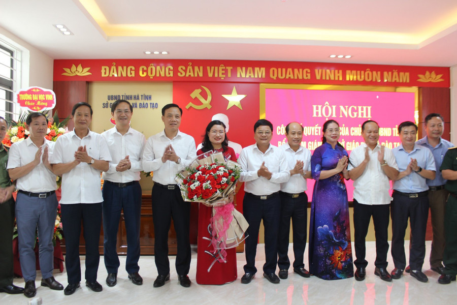 | Lãnh đạo tỉnh Hà Tĩnh trao quyết định bổ nhiệm và tặng hoa chúc mừng tân Giám đốc Sở GD&ĐT. |