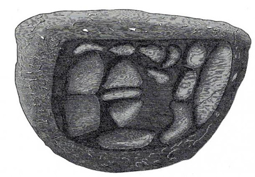 "Nó có hình bầu dục không đều, đường kính gần 18 cm, mặt trên sần sùi do có một tá viên đá dăm kích cỡ khác nhau dính liền bởi một lượng nhỏ xi-măng mịn mượt; tảng đá như thể từng vỡ tan tành rồi được gắn lại".