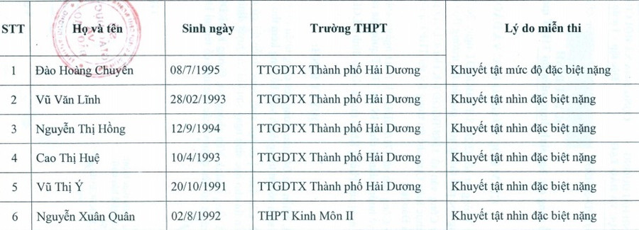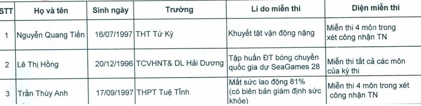 Danh sách thí sinh và lý do miễn thi đợt 1 cụ thể như sau:
