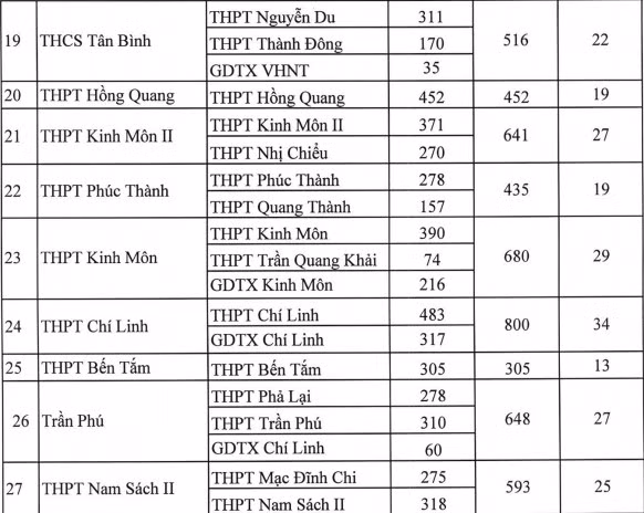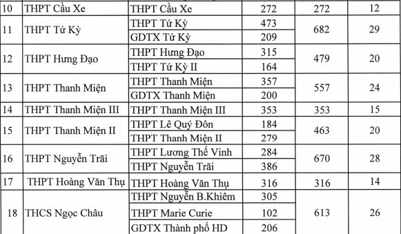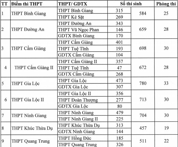 Theo đó, hầu hết Hải Dương thành lập các điểm thi liên trường, gồm từ 2 đến 3 trường. Một số điểm thi chỉ gồm một trường THPT như: THPT Cầu Xe, THPT Thanh Miện III, THPT Hoàng Văn Thụ, THPT Hồng Quang, THPT Bến Tắm, THPT Đồng Gia.