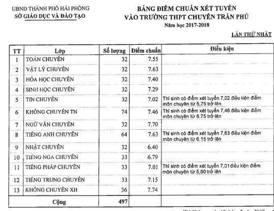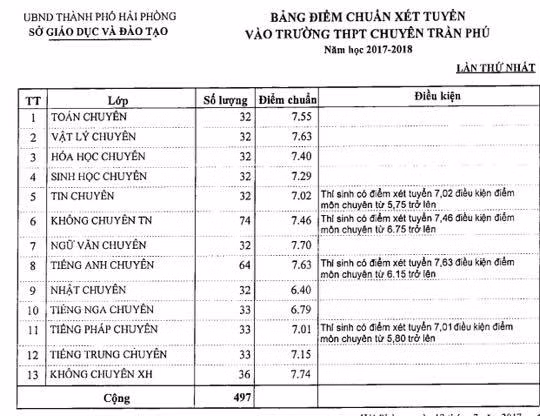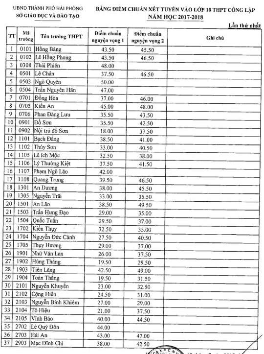 Điểm chuẩn các trường THPT công lập tại Hải Phòng như sau:
