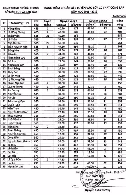 Cụ thể, điểm chuẩn vào các lớp 10 THPT công lập trên địa bàn Hải Phòng như sau: