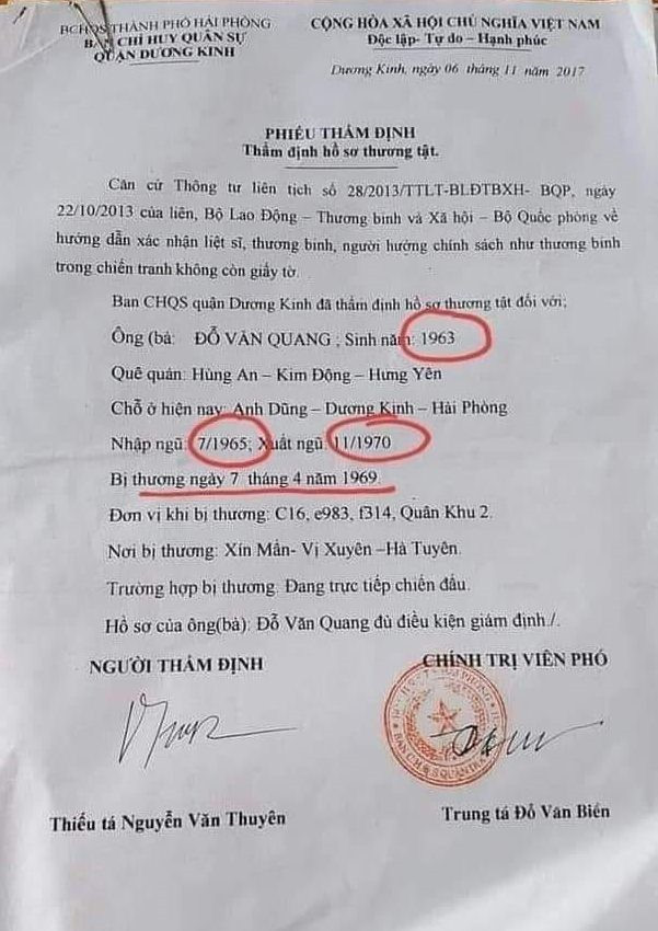 Cụ thể, phiếu thẩm định hồ sơ thương tật được cho là của Ban Chỉ huy Quân sự quận Dương Kinh về việc thẩm định hồ sơ thương tật đối với ông Đỗ Văn Quang, quê quán Hùng An, huyện Kim Động (Hưng Yên), chỗ ở hiện nay phường Anh Dũng, quận Dương Kinh (TP Hải Phòng) do Trung tá Đỗ Văn Biền Chính trị viên phó ký ngày 6/11/2017.