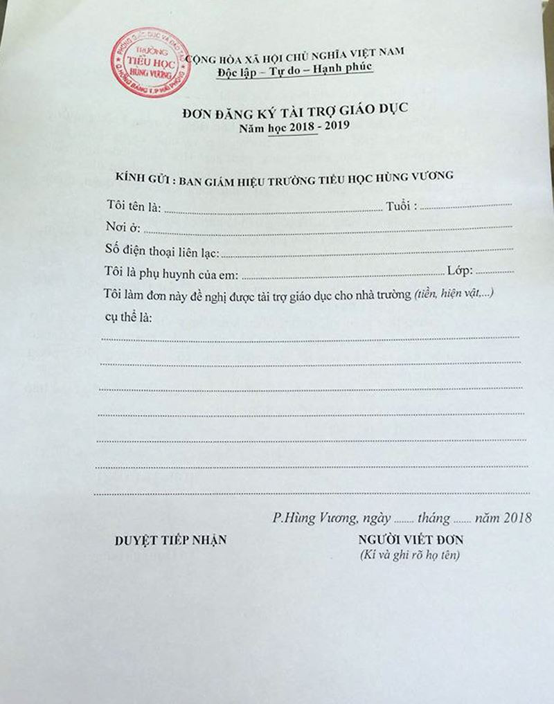 | Mẫu tờ đơn tài trợ giáo dục có đóng dấu treo của trường Tiểu học Hùng Vương và thư ngỏ cùng chữ kí của hiệu trưởng nhà trường |