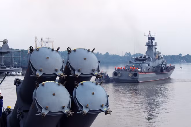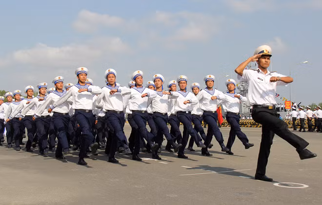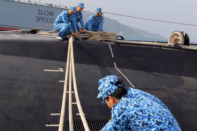 Thủy thủ tàu ngầm Kilo 636 trong bài tập làm dây tại cảng. Ngày 3/4, Hải quân Việt Nam đưa vào hoạt động hai tàu ngầm HQ-182 mang tên Hà Nội và HQ-183 mang tên TP HCM. Tàu dài 73,8 m, rộng 9,9 m, có thể hoạt động độc lập trong 45 ngày và thích hợp cho các nhiệm vụ trinh sát, chiến đấu. Đây là hai trong số 6 tàu ngầm Kilo thế hệ thứ 3 được Việt Nam đặt mua của Nga.