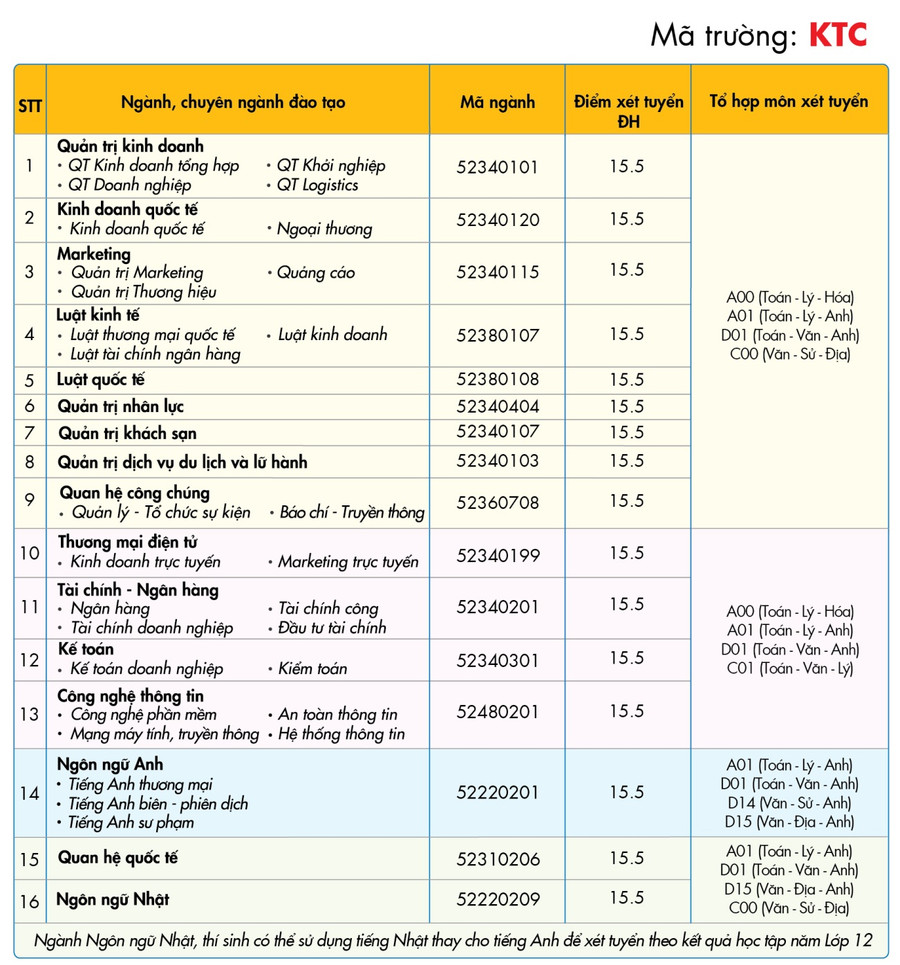 | Ngôn ngữ Nhật | 52220209 | A01 (Toán, Lý, Anh) |