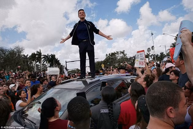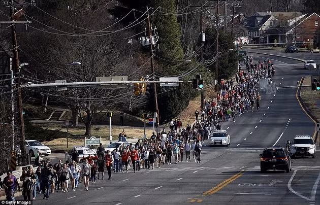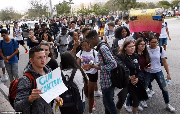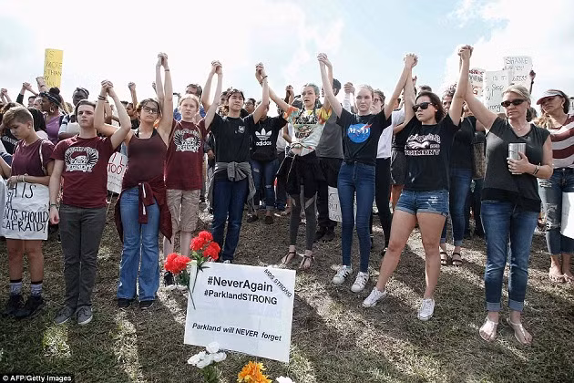 Khoảng 2.000 học sinh, phụ huynh và giáo viên đã mặc quần áo mang sắc màu của trường Marjory Stoneman Doughlas và nắm tay nhau, hô khẩu hiệu bên ngoài trường. Những khẩu hiệu đó là: “Chuyện này không bao giờ lặp lại nữa!” và “Tôi sẽ không trở thành nạn nhân”.