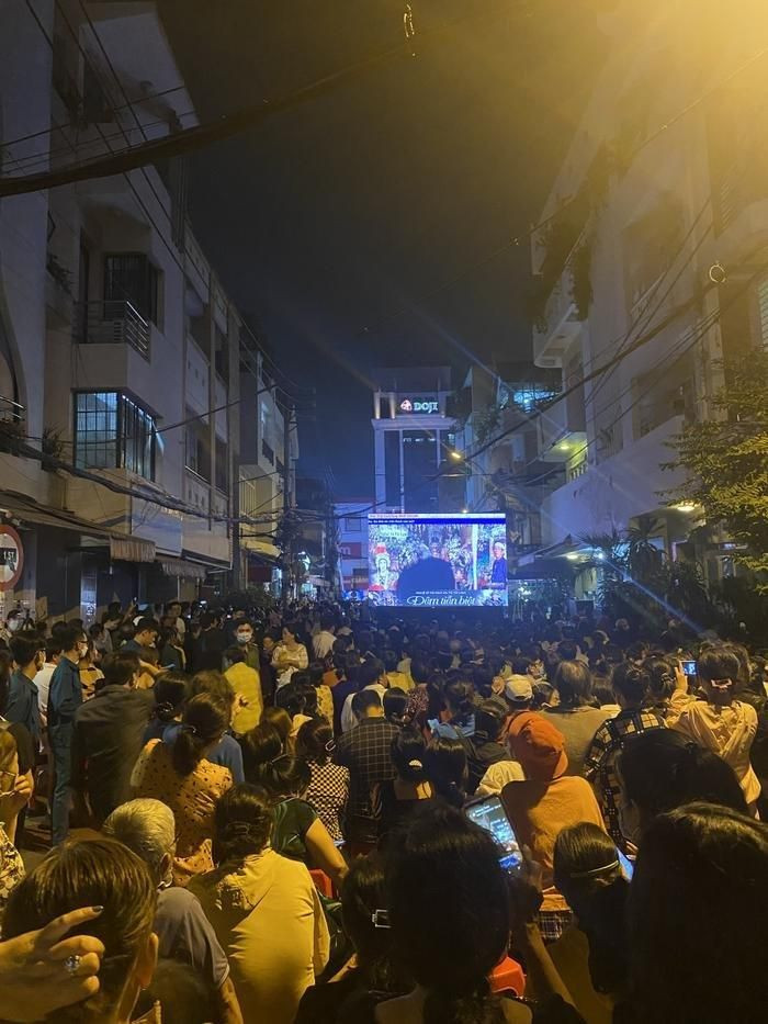 Phía ngoài khu vực lễ tang gia đình cho lắp màn hình led để phục vụ bà con, thế nên khi thắp hương xong bà con có thể tìm một chỗ ngồi thích hợp để xem đêm nhạc. Sau đêm nhạc, từ 1h bà con có thể vào viếng đến 10 - 11h trưa mai".