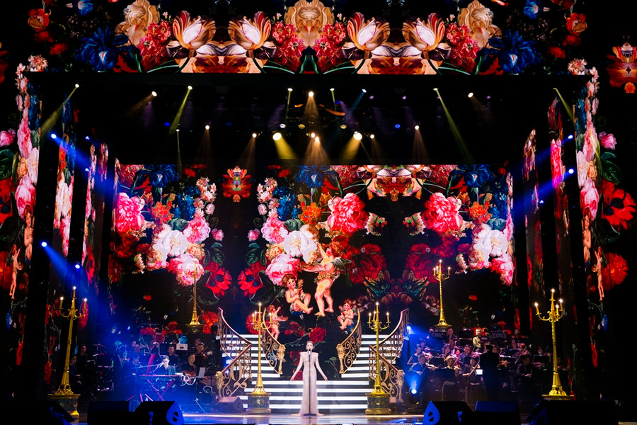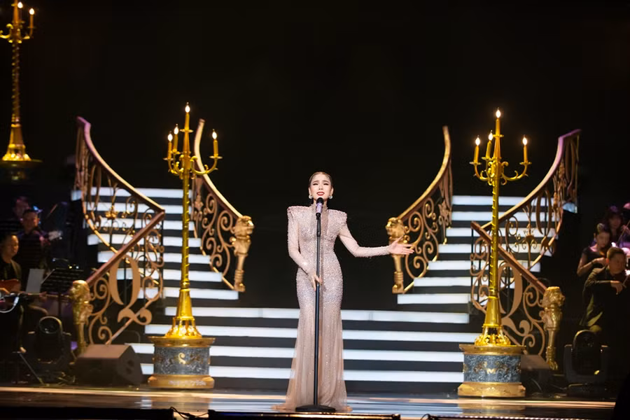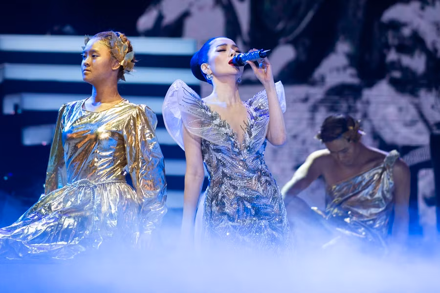 | Cũng giống như 2 đêm diễn trước đó tại TP.HCM, kỹ thuật ánh sáng sân khấu được sử dụng để che đi khuôn mặt của mẹ nữ ca sĩ. |
