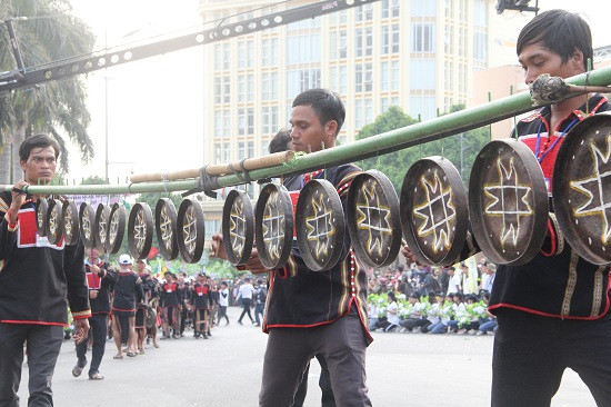 | Đoàn diễu hành dàn chiêng đại diện cho các dân tộc Ê Đê, Xê Đăng, Jơ Rai, Mường… làm toát lên nét văn hóa đặc sắc của đồng bào trên mảnh đất Tây Nguyên. |