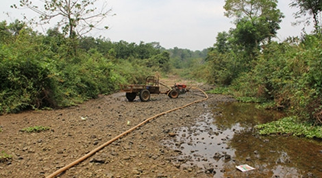 | Sông suối cạn trơ đáy, người dân phải chắt chiu từng vũng nước còn sót lại để cứu cây trồng. |