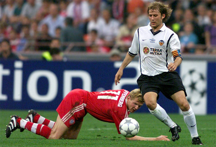 | Valencia của Mendieta (áo trắng) là đội bóng khó chịu bậc nhất châu Âu trong những năm giao thời cuối thập niên 1990 đầu 2000. |