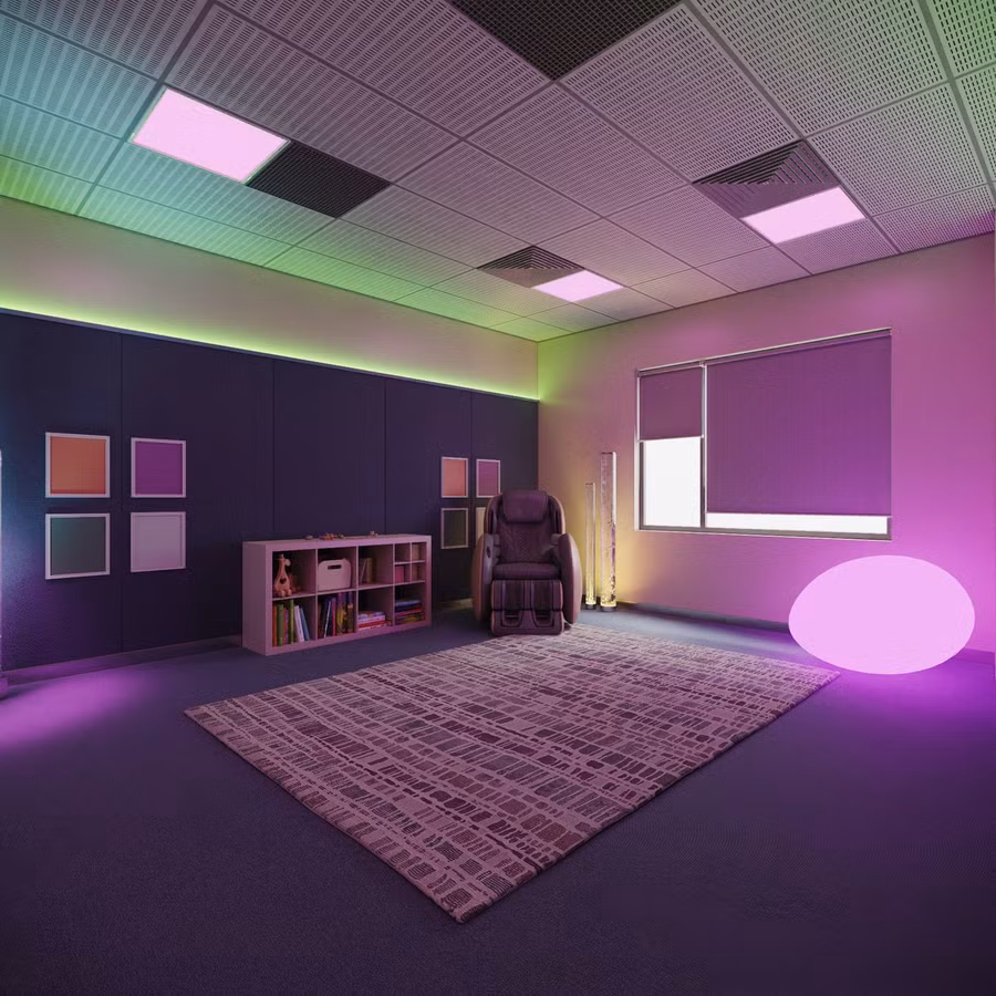 Các phòng can thiệp 1:1 và nhóm nhỏ được bố trí riêng tư, tối giản về thị giác nhằm giúp học sinh cảm thấy an toàn và tập trung vào quá trình trị liệu.