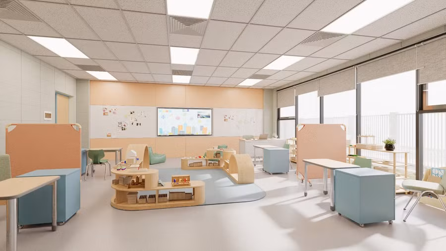 Không gian lớp học được thiết kế linh hoạt, có thể chuyển đổi từ khu vực chung sang không gian cá nhân hóa theo nhu cầu hỗ trợ của từng học sinh.
