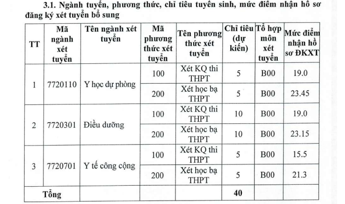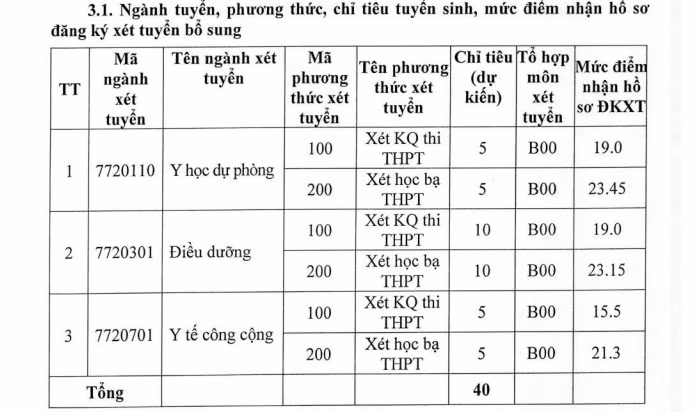 Trường ĐH Hòa Bình cũng thông báo xét tuyển bổ sung 395 chỉ tiêu cho nhiều ngành đào tạo. Trong đó, với các ngành thuộc nhóm Sức khỏe, điểm sàn nhận hồ sơ bằng ngưỡng đảm bảo quy định chất lượng tối thiểu của Bộ GD&ĐT, các ngành khác đạt từ 15 điểm.