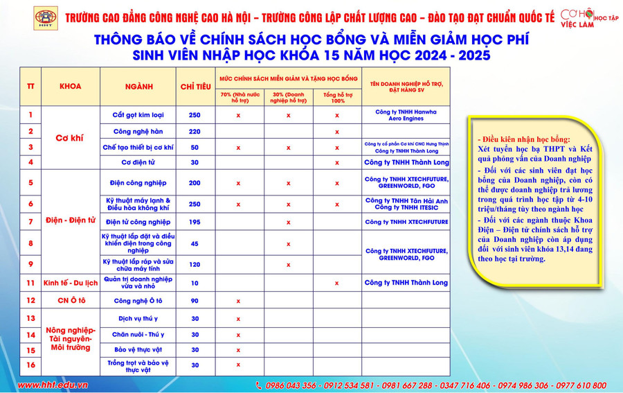 Trong bối cảnh học phí ngày càng tăng, khác với nhiều năm trước, mùa tuyển sinh năm 2024; các chương trình học bổng tại trường Cao đẳng Công nghệ cao Hà Nội đa dạng hơn. Đó sẽ là nguồn hỗ trợ tài chính giúp học sinh, sinh viên (HSSV) giảm bớt áp lực kinh tế trong những năm tháng học tập.