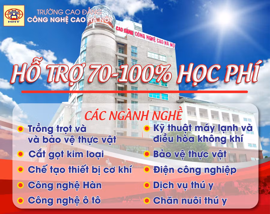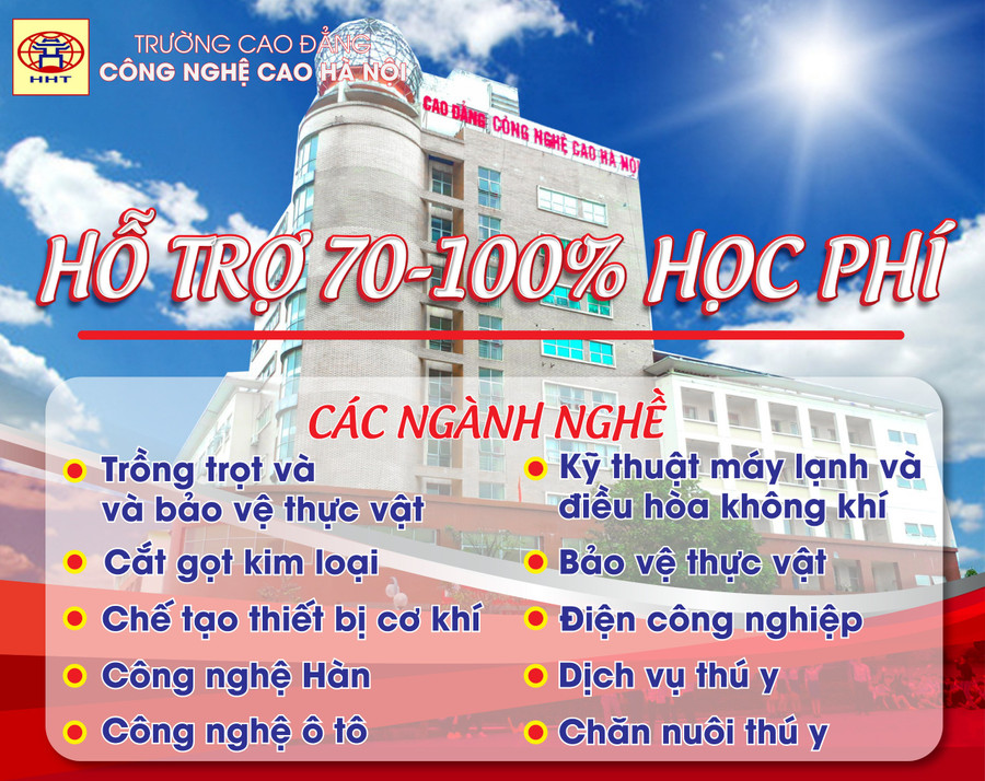 Năm học 2024 – 2025, Trường Cao đẳng Công nghệ cao Hà Nội (HHT) tuyển sinh 3500 chỉ tiêu ở các hệ đào tạo: Cao đẳng, THPT – Cao đẳng, Liên thông, Sơ cấp – ngắn hạn,… với 42 nghề đào tạo thuộc các nhóm ngành: Công nghệ thông tin, Điện – Điện tử, Cơ khí, Chăm sóc sắc đẹp, Công nghệ ô tô, Ngoại ngữ – Kinh tế, Du lịch, Môi trường, Nông nghiệp,…
