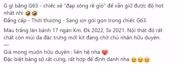 Nội dung rao bán xe của Hiền Hồ cũng là một trong những điểm thu hút cộng đồng mạng: "G gì bằng G63 - chiếc xế 'đạp sóng rẽ gió' để vẫn giữ được độ hot nhất nhì. Màu trắng lăn bánh 17 ngàn km, đăng ký năm 2022, sản xuất năm 2021...".