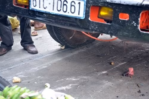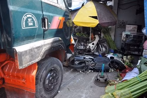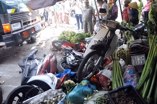 Tại hiện trường gần 10 xe máy nằm lăn lóc dưới chân cầu, bên hông và trên đầu xe ben, các phương tiện bị hư hỏng nặng. Nhiều mặt hàng rau củ quả của các hộ dân kinh doanh chợ tự phát bên đường Lê Đức Thọ bị xe ben ủi văng tứ tung.