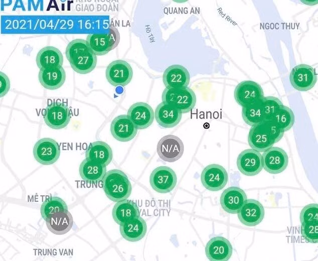 Ghi nhận chất lượng không khí tại Hà Nội trong ngày 29/4 cho thấy, chỉ số chất lượng không khí AQI hầu hết đều ở mức dưới 50, ngưỡng rất tốt cho sức khỏe.