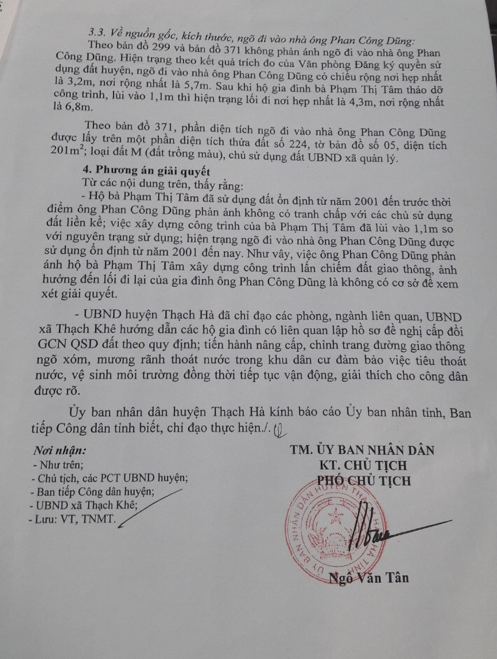 Mặc dù kết quả kiểm tra cho thấy gia đình bà Phạm Thị Tâm được cấp đất với diện tích 200m2, nay diện tích đất sử dụng lên đến 329,8m2 (tăng thêm gần 130m2). Kết luận từ UBND huyện Thạch Hà lại đưa ra hoàn toàn trái ngược với kết quả kiểm tra, khi cho rằng người dân phản ánh hộ bà Tâm xây dựng công trình lấn chiếm đất giao thông, ảnh hưởng đến lối đi lại của người dân là không có cơ sở để giải quyết.