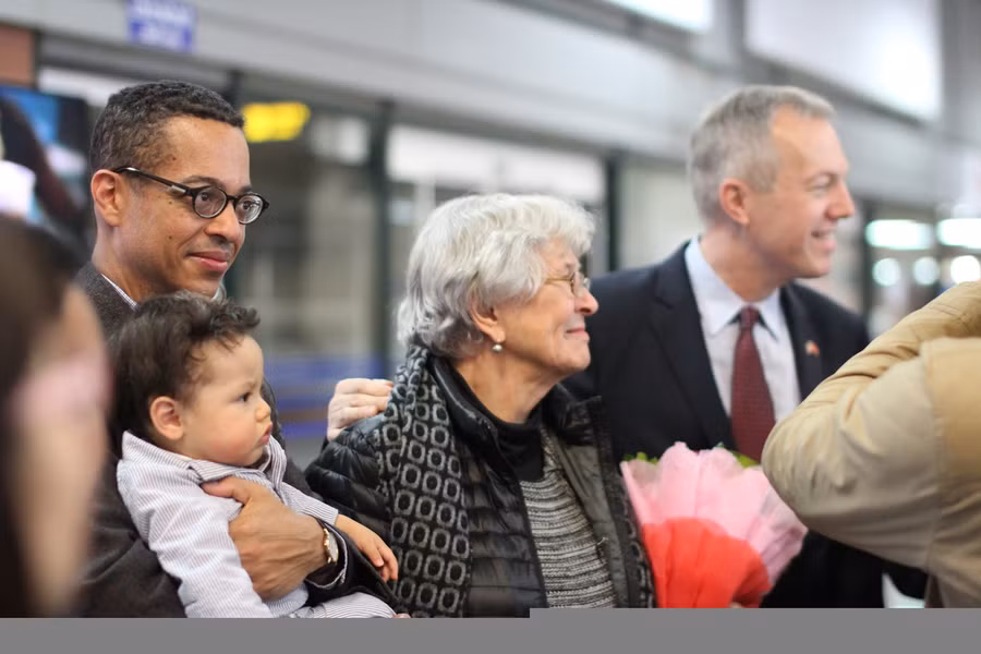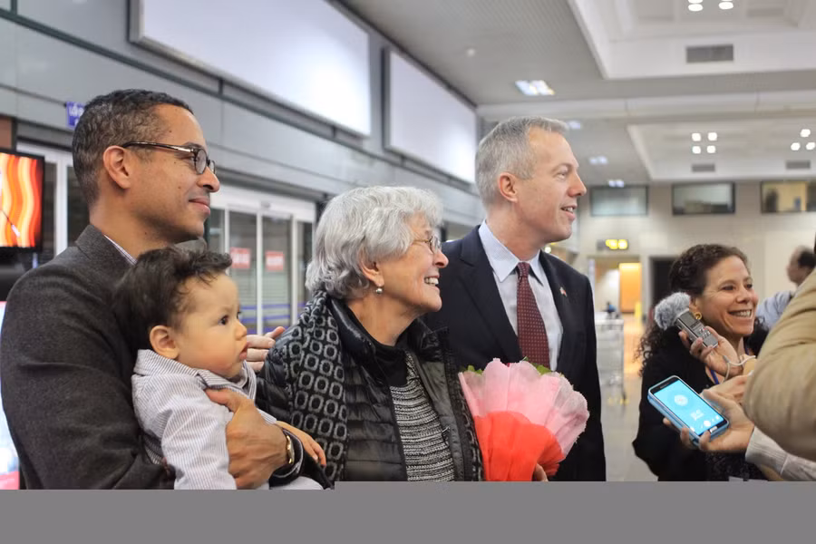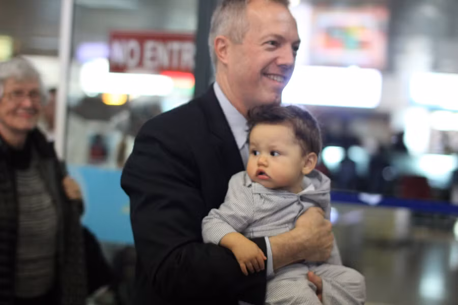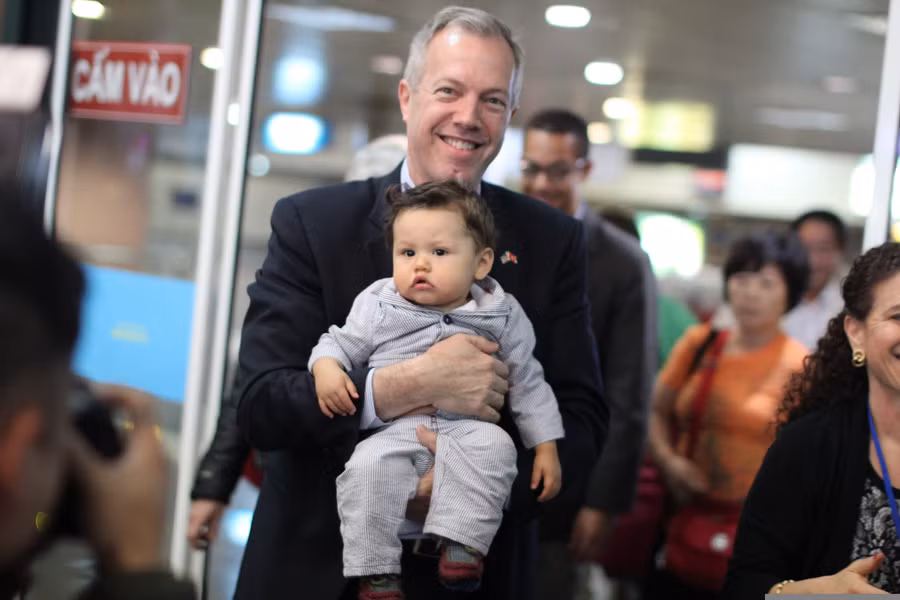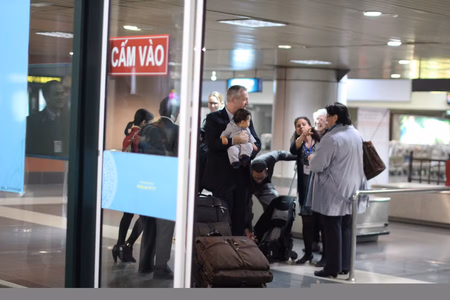 Ông Ted Osius đặt những bước chân đầu tiên vào lãnh thổ VIệt Nam với con trai trên tay. Phía sau là bạn đời của ông, Clayton Bond.