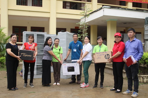 Nhiều tổ chức, cá nhân có tấm lòng hảo tâm đã và đang hướng về Nặm Păm, hỗ trợ xây trường, ủng hộ đồ dùng phục vụ dạy và học, quần áo học sinh, đồ dùng sinh hoạt bán trú cho các em. Ảnh: Tổ chức Cứu trợ trẻ em quốc tế trao tặng Trường Tiều học và Trường THCS Nặm Păm máy tính và thiết bị văn phòng phẩm