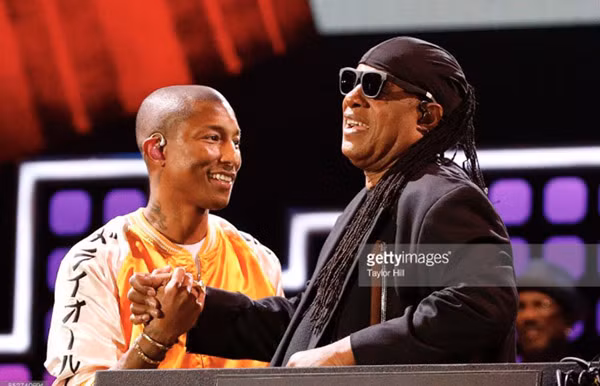 Dự sự kiện có huấn luyện viên The Voice Mỹ Pharrell Williams (trái) và huyền thoại âm nhạc Mỹ Stevie Wonder.
