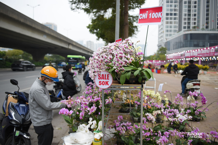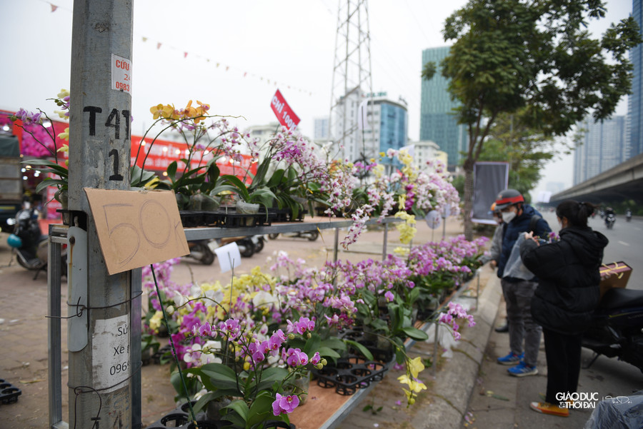 | Dọc đường Phạm Hùng, hoa lan giá khoảng 100 ngàn đồng được bày bán đầy vỉa hè. |