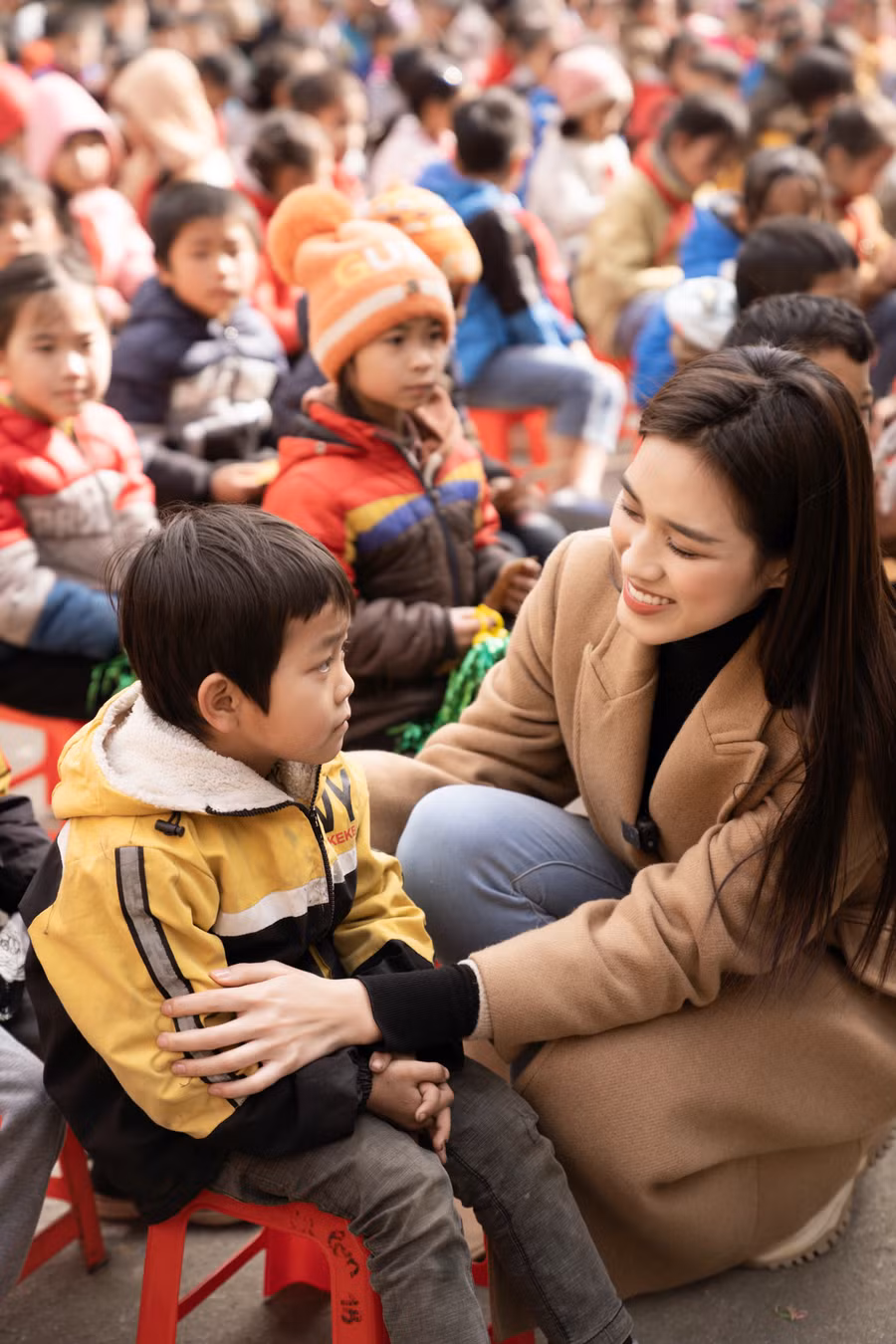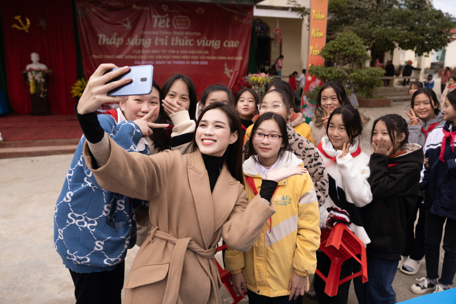 Tại đây, cô cũng chuẩn bị phần quà gồm học bổng cho các em nhỏ cũng như gói quà gồm các nhu yếu phẩm dành cho gia đình trong dịp Tết cận kề. Nàng hậu sinh năm 2001 cũng dành lời động viên đến các em, cổ vũ tinh thần cho các em trong việc tiếp tục theo đuổi con đường học tập.