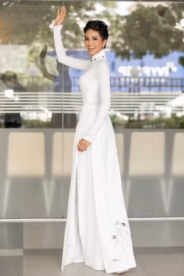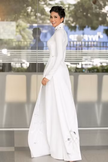 Nếu như ở những lần xuất hiện trước, Hoa hậu H’Hen Niê chọn trang phục có xu hướng tôn dáng gợi cảm, nhưng thời gian gần đây người đẹp quyết định mặc áo dài truyền thống cho một chủ đề liên quan đến người phụ nữ Việt Nam.