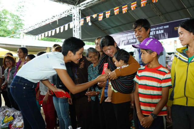 Hoa hậu H’Hen Niê đã tận tay trao phần quà cho người dân và liên tục nở nụ cười thân thiện. Đặc biệt, với các em nhỏ, Hoa hậu H’Hen Niê rất thích bế các em, cũng dành nhiều lời chúc tốt đẹp cho các em.