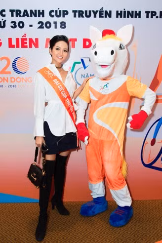 Người đẹp được đại diện BTC trao sách và hoa. Xuất hiện tại buổi họp báo Hoa hậu H’Hen Niê vẫn “trung thành” với style áo trắng quen thuộc. Cô khéo léo kết hợp thêm chiếc vòng đeo cổ và quần jeans đen năng động, thể hiện sự khỏe khoắn, phù hợp với tiêu chí của chương trình mà cô làm đại sứ.