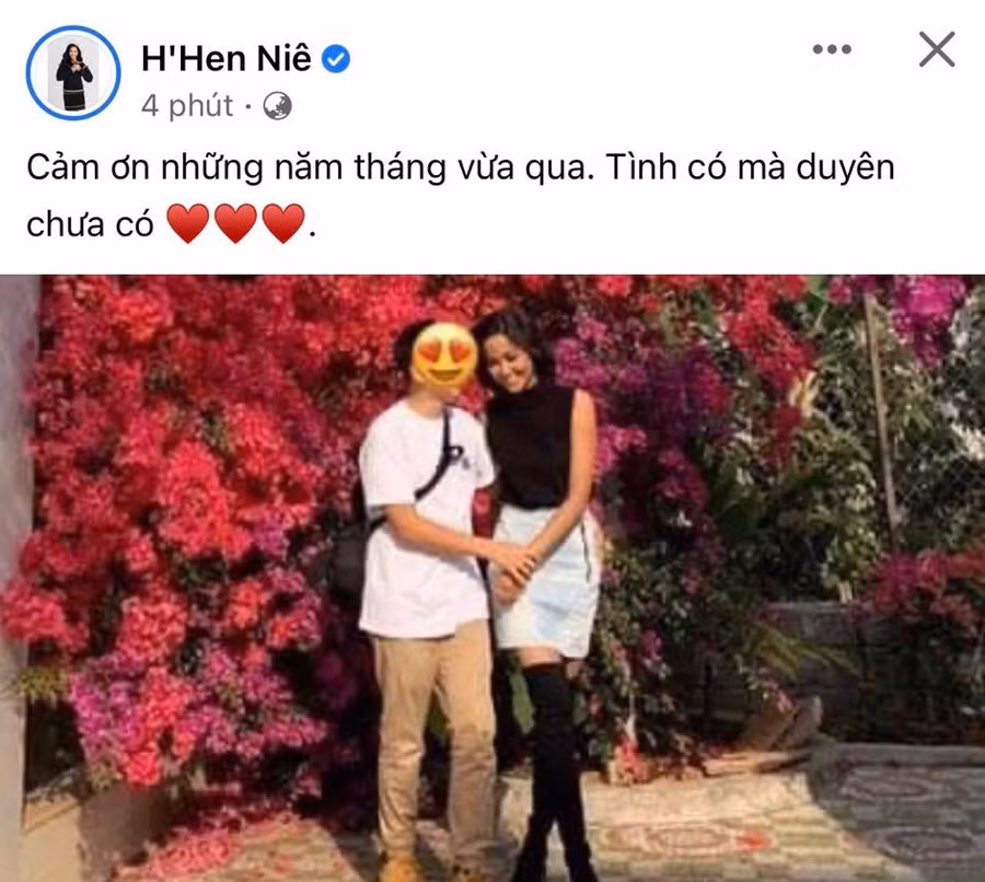 Mới đây, H’Hen Niê đã bất ngờ công khai chuyện mình đã chính thức chia tay nhưng vẫn quyết giấu dung nhan của bạn trai tới cùng. Cô viết: “Cảm ơn những năm tháng vừa qua. Tình có mà duyên chưa có”.