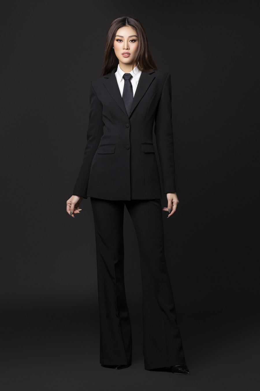 Sang tone trang phục vest đen kết hợp cà vạt, Khánh Vân mang đến thông điệp về nữ quyền trong thời đại mới “Dù ở vai trò nào, phụ nữ vẫn có thể làm tốt nếu như có sự quyết tâm, đam mê và không ngừng chinh phục”.