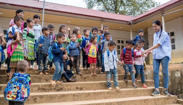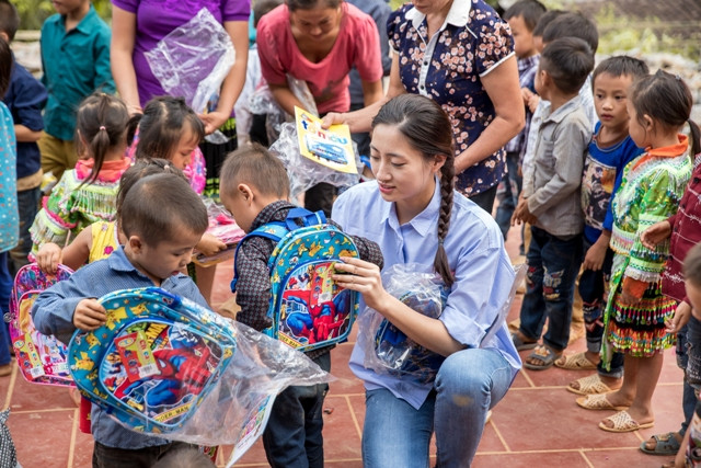 Nàng hậu giản dị thân thiện vui đùa với các bé và dành tặng các em những phần quà ý nghĩa mừng năm học mới.