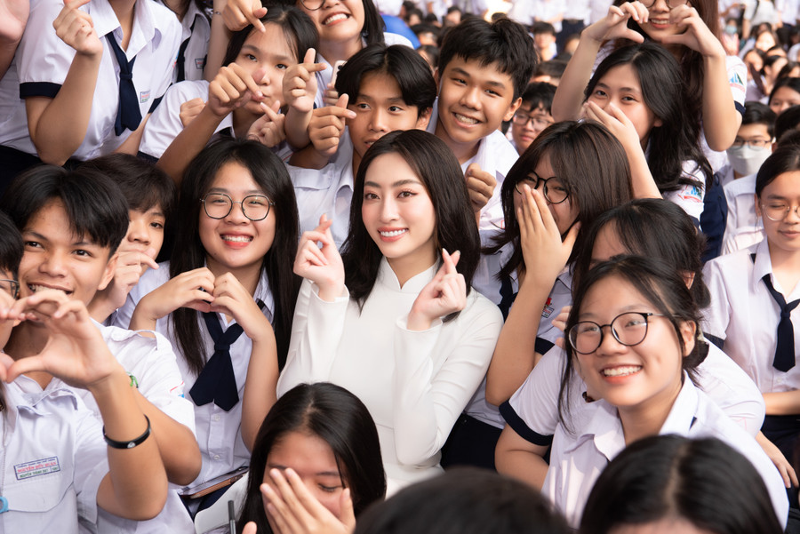 | Cuối chương trình, Hoa hậu Lương Thuỳ Linh còn ký tặng bookmark, chụp hình kỉ niệm với hàng ngàn học sinh. |