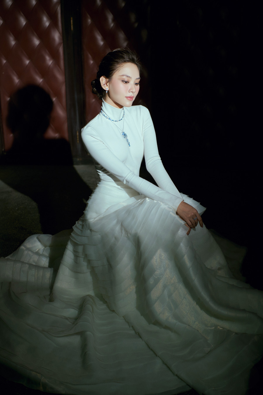 Hoa Hậu Mai Phương tỏa sáng với vẻ đẹp kiêu sa trong chiếc váy trắng xòe thướt tha. Thiết kế được thực hiện công phu với phần thân ôm sát tối giản và điểm nhấn là chân váy xòe xếp tầng thời trang và thanh lịch nhưng không kém phần quyến rũ.