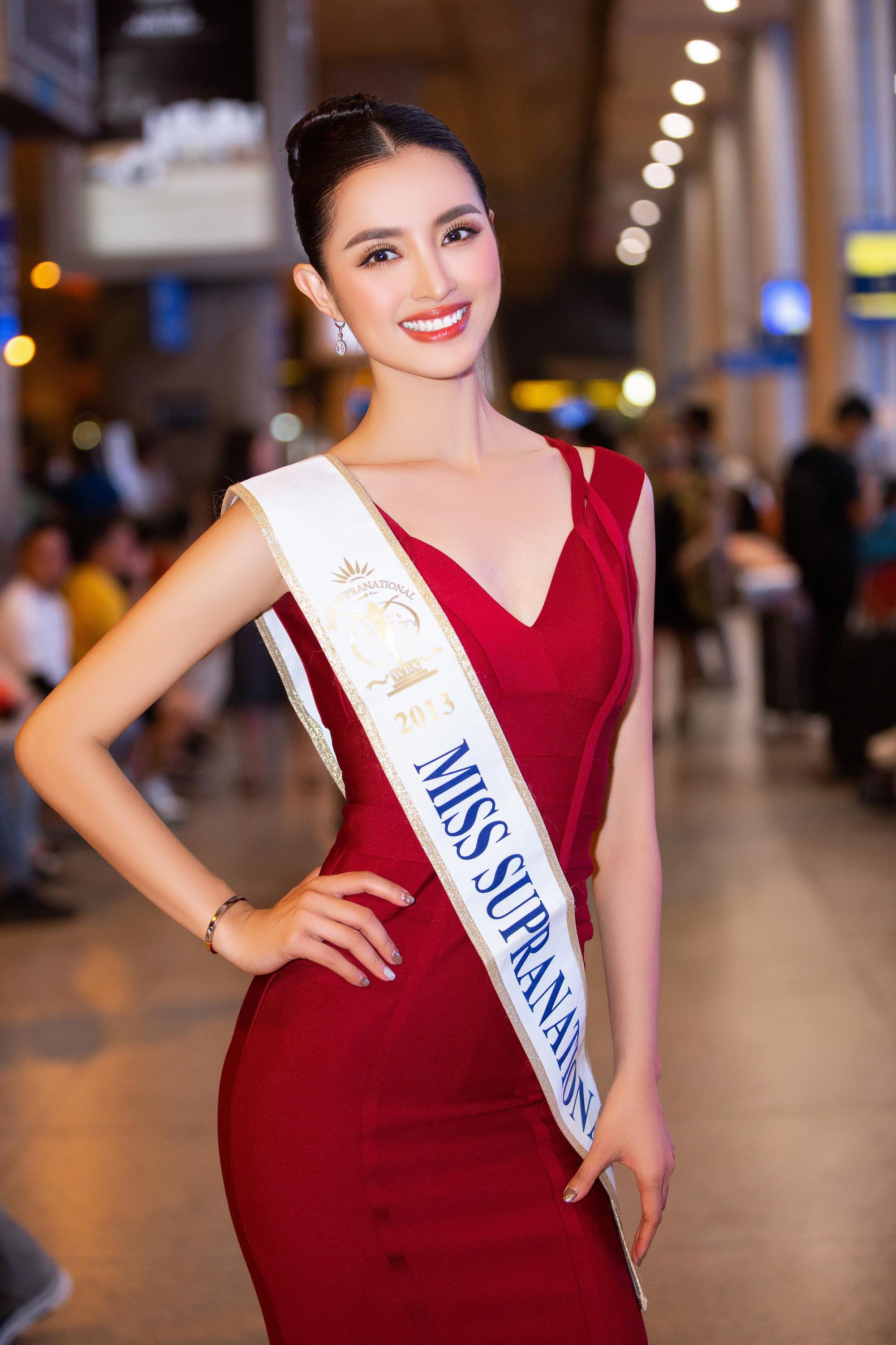 | Xuất hiện tại sân bay Tân Sơn Nhất, Hoa hậu Siêu quốc gia 2013 rạng rỡ trong trang phục đầm đỏ đơn giản với kiểu tóc búi cao nhưng vẫn tôn lên nhan sắc tựa như nữ thần của mình. |