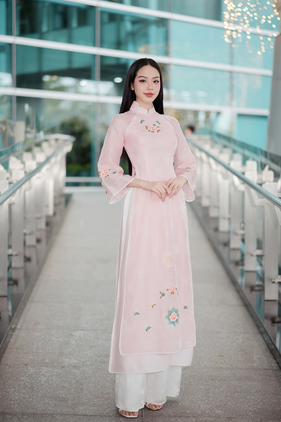 | Hoa hậu Thanh Thủy diện áo dài, đón tiếp Sở du lịch và Giám đốc truyền hình Nhật Bản. |