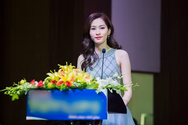 Người đẹp tự tin phát biểu trước đông đảo khách mời.