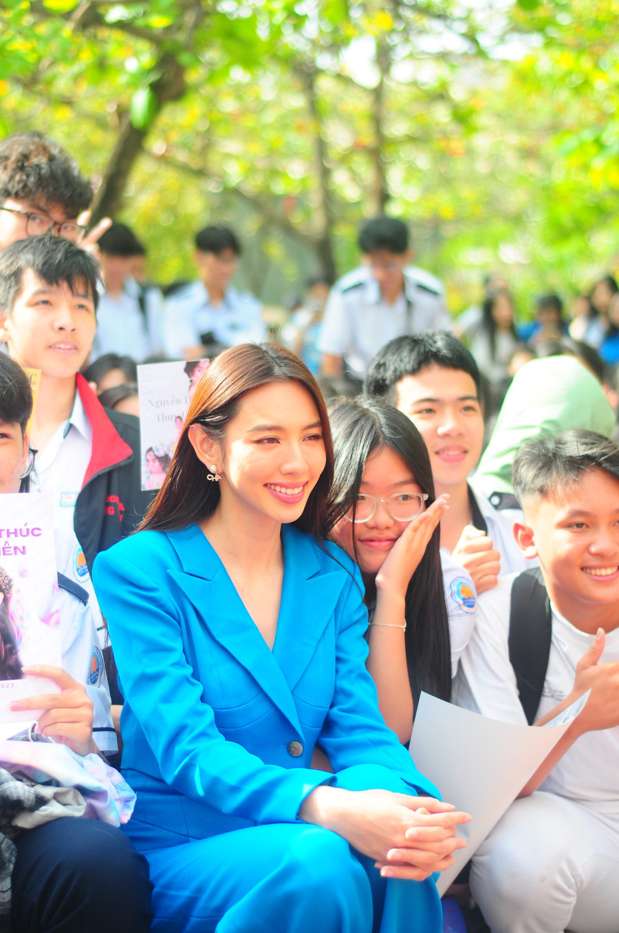 Tại mỗi trường đi qua, Thùy Tiên dành thời gian giao lưu cũng như chia sẻ những câu chuyện về bài học, kinh nghiệm của bản thân để truyền cảm hứng cho các bạn trẻ.